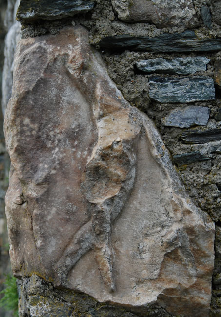 Eckblock: auf der Vorderseite mythische Figur: nackter tanzender Satyr (Mänade ?), in der Linken Weintraube (?).