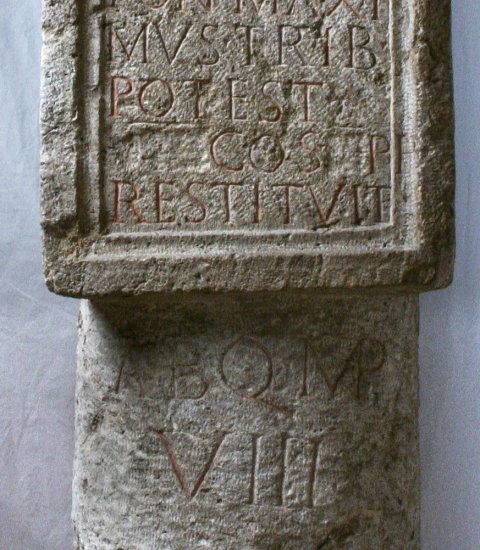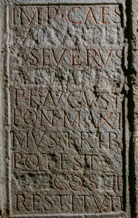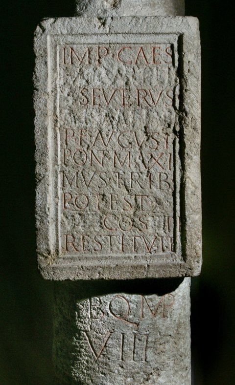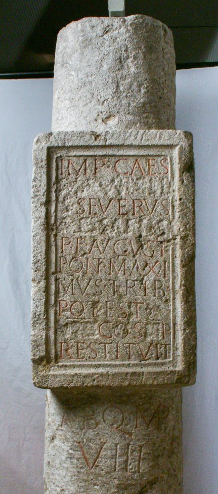 - Imp(erator) Caes(ar) / [[M(arcus) Aureli]]/us Severus / [[Alexander]] / P(ius) F(elix) Augustus / pont(ifex) maxi/mus trib(unicia) / potest(ate) / [[VIII]] co(n)s(ul) III p(ater) p(atriae) / restituit / ab (A)q(uinco) m(ilia) p(assuum) / VIII