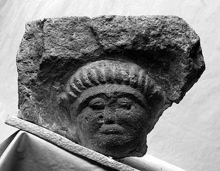 - Oben und rechts abgeschlagene Rahmenleiste. Im Eck fronteler Kopf eines bartlosen Mannes mit in die Stirn gekämmten Haarsträhnen. Links Rest einer weiteren Figur ?