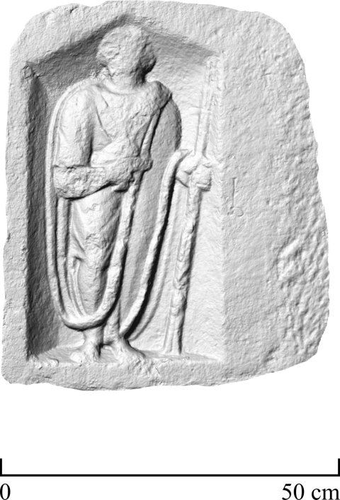 - Rahmenlose Nische mit Giebelabschluss. Nach rechts hin stehender Lictor.