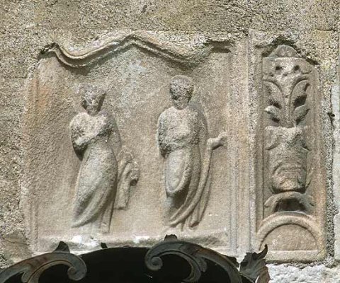 - In Rechteckfeld mit Giebel zwei Ganzfiguren (Ehepaar). Links Frau, rechts Mann: bärtig, Toga, in der Linken Rolle (volumen). Rechts schmales Feld mit Akanthus, oben Giebel, unten halbkreisförmig eingezogen.