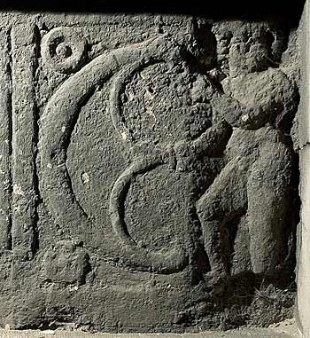 - Profiliert gerahmtes Schriftfeld mit Peltenhenkeln, die von nackten Knaben (Genius) gehalten werden. Zwischen Rahmen und Pelten Rosetten.