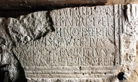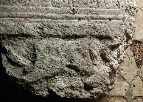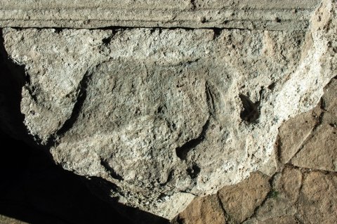 - Profiliert gerahmtes Schriftfeld zwischen kannellierten Pilastern. Reliefreste eines Sockelbildes (Mythos: Lupa Capitolina).