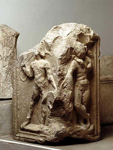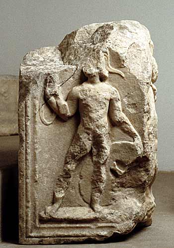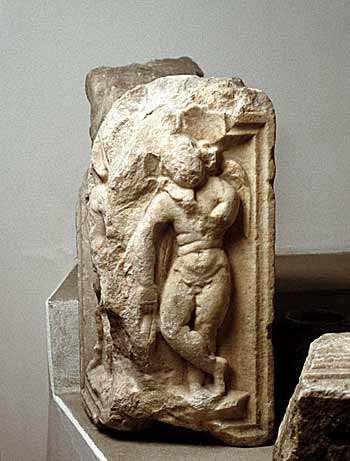 Eckblock: auf der Vorderseite mythische Figur (Mars, Heros ?). Auf Podest Jüngling mit Waffen: Helm, Schild, in der erhobenen Rechten Schwert.