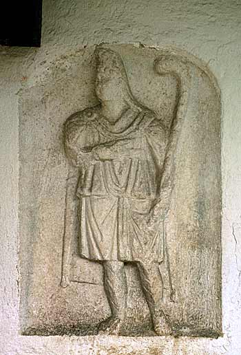 - Mythische Figur: in Rechteckfeld Attis mit phrygischer Mütze und überkreuzten Beinen, Hirtenstab (Pedum) im linken Arm.