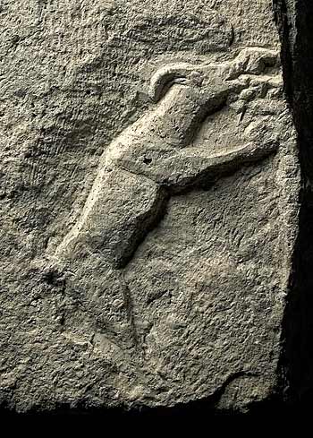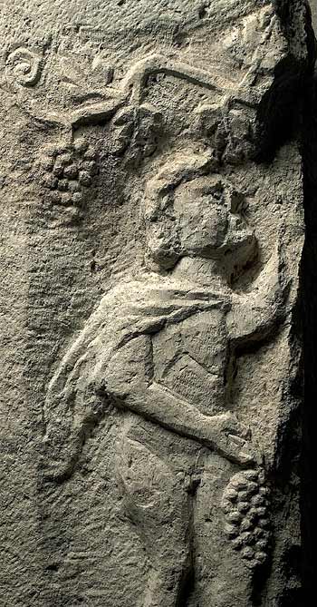 Linker Eckblock der Sockelzone eines Grabbaus. Vorderseite: nach rechts hin stehender Jüngling bei der Weinlese, nackt bis auf Schultermantel. Unterhalb Sockelbild mit halbaufgerichtetem Tier (Ziege ? Hase ?).