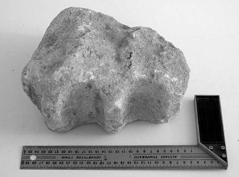 - Fragment einer Säule mit Torus, Platte, Anlauf, ionischen Kanneluren; elf Kanneluren vorhanden, Stegbreite 2-2.7 cm; Oberlager: Zahneisen-Glättung, radiale Risslinie, ausgebrochener Rest eine Hebelochs im Zentrum, Dübelloch mit Vergusskanal (bzw. Überlaufkanal); der Säulendurchmesser lässt sich auf ca. 0.295 berechnen.