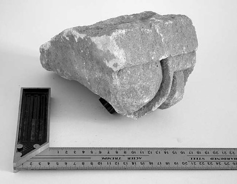 - Eierstabfragment vom oberen Eierstab (Corona-Vorderseite) eines Konsolgesimses des Tempels I; erhalten ist ein oben gekapptes Ei, die links anschließende Schale abgebrochen, rechts anschließende Schale mit dem oberen Balken, pfeilförmiges Zwischenglied.