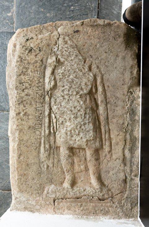 - Fragment, rundum verbr., stark bestoßen, neuzeitliche Inschrift