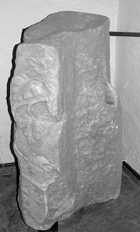 - Friesblock mit Weinranken, S-förmig verlaufende Ranke; links und rechts gebrochen, weite Bereiche abgeschlagen (zur sekundären Versetzung zugerichtet ?); auf Oberlager Hebeloch - volle Breite des Blocks lässt sich auf 1.75, Tiefe auf 0.66 errechnen).