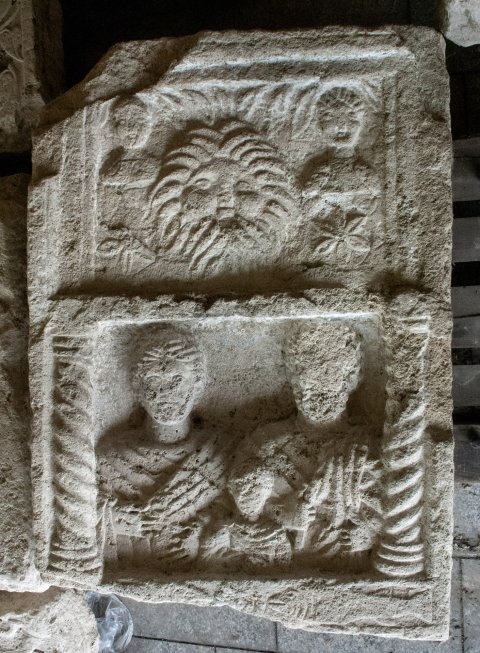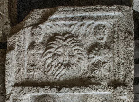 - Zwei rechteckige Bildfelder übereinander, das obere mit profiliertem Rahmen. Darin bärtige Maske (Okeanos ?), flankiert von zwei Büsten über Sternrosetten. Über der Maske Reihe von Blättern (?). Im unteren Bildfeld zwischen Säulen mit Spiralkannelluren Brustbilder einer Familie: links Frau im Mantel, Haar gescheitelt und gesträhnt. Rechts bärtiger Mann im Mantel (Toga ?), vorn Knabe im Sagum. Auf dem Zwischenfries darunter zwei Fische.