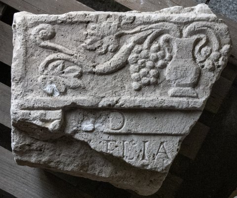- Zwischenfries: Krater mit Weinranken. Schriftfeld zwischen Pilastern.