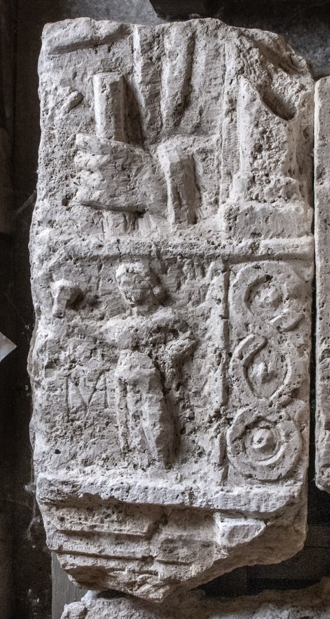 - Vom mit Säulen gerahmten Hauptbild nur untere linke Ecke erhalten (linke Hand eines Mannes mit Rolle (volumen). Im Zwischenbild Totenopfer (Dienerin mit mappa und Gefäß in der erhobenen Hand. Seitlich Flechtband. Unterhalb Rest eeines profilierten Gesimses und eines Kapitells vom Rahmen des Schriftfeldes.