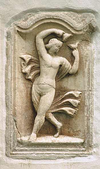 - Mythische Figur, Musikinstrument: in Bogennische auf flachem Podest tanzende Mänade, nackt bis auf Mantel um linken Arm und rechte Hüfte, in den erhobenen Händen Schallbecken (Kymbala).