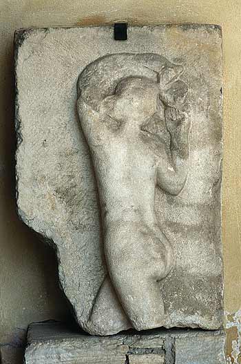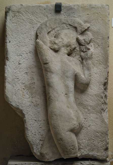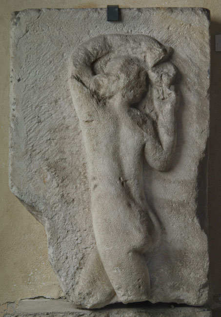 - Mythische Figur, Musikinstrument: tanzende nackte Mänade in Rückenansicht, in den erhobenen Händen Schallbecken (Kymbala).