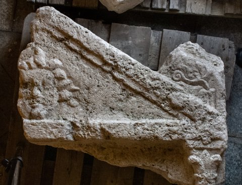 - Gerahmter Giebel mit Gorgoneion, Seitenakroter mit Ornament. Vom Hauptbild nur Rest einer Säule mit Blattkapitell erhalten.