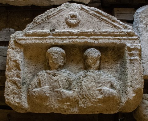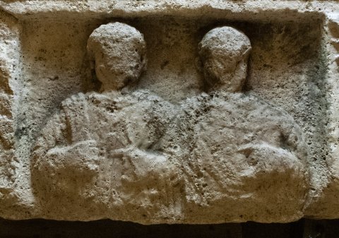 Hauptbild: tiefe Rechtecknische zwischen Säulen. Brustbilder von zwei Männern im Mantel (linker mit Paenula und Peitsche in der Linken ?).