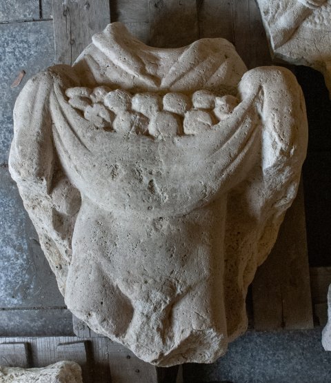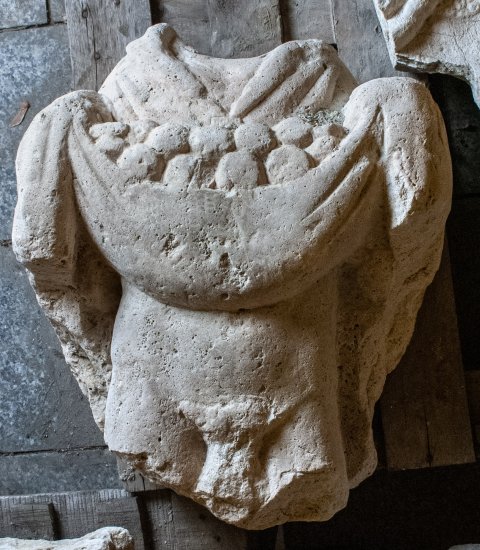 - Mythische Figur : stehender Priapus mit entblößtem Unterkörper. Mantel über Schultern und Armen, im hoch vor die Brust gehobenen Mantelbausch Früchte.