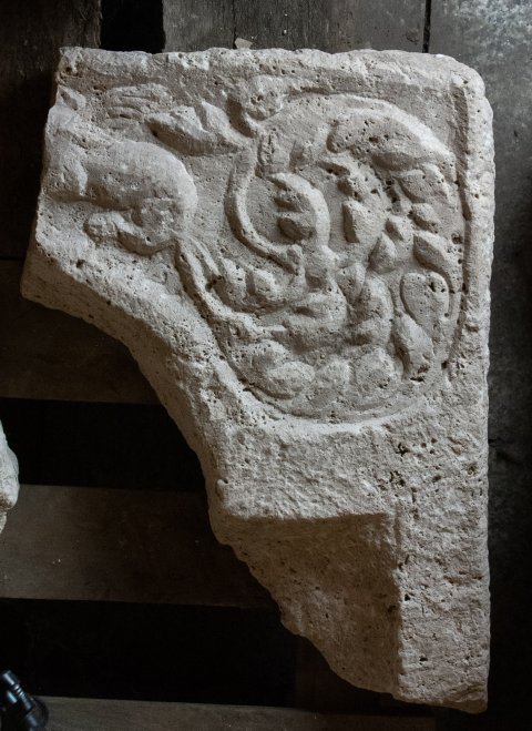 - Im Zwickel rechts der Bogenöffnung Akanthusblatt, links davon über dem Bogen geflügeltes Meerwesens (Seegreif ?).