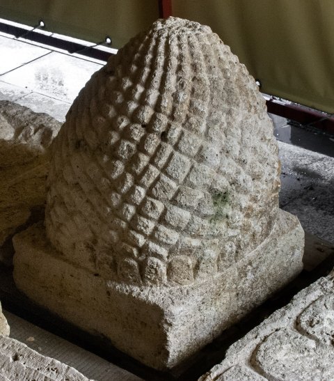 - Pinienzapfen auf quaderförmigem Sockel