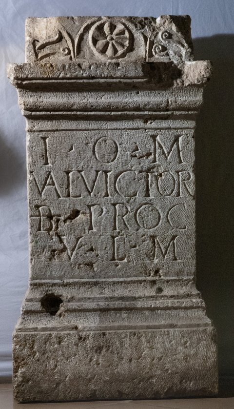 - I(ovi) O(ptimo) M(aximo) / Val(erius) Victor / b(ene)f(iciarius) proc(uratoris) / v(otum) l(ibens) m(erito)
