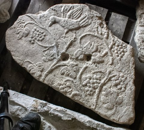 - Fragment mit Teil des rechten Randes, in der Reliefoberfläche 2 Löcher