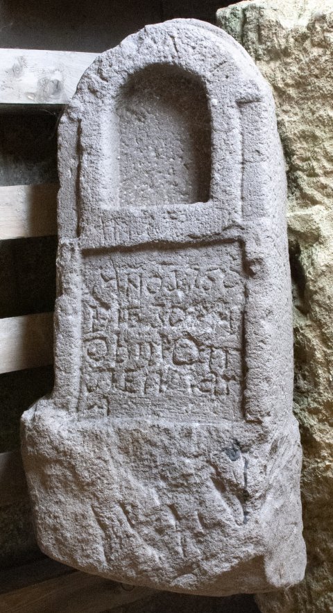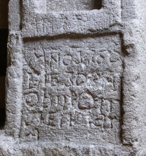 - bestoßen, auf der Rückseite Kreuz eingemeißelt, Inschrift neuzeitlich überarbeitet