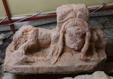- Liegende Löwen mit Tierkopf unter den Vorderpranken, zwischen ihnen Block mit menschlichem Kopf auf der Vorderseite (Frauenkopf mit Schleier ?, auf dem Oberkopf Flügel ? (Gorgoneion ?).