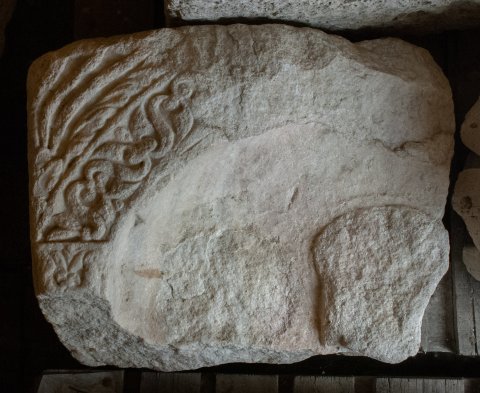 - Bildfeld unter Rundbogen, Spuren von zwei völlig abgeschlagenen Köpfen (mindestens ein drittes Porträt war vorhanden). Bogen mit einer stilisierten Lotusranke und einem tordierten Band gerahmt, darüber Rest eines Eckakroters mit Palmette. Unten Ansatz eines Pilasterkapitells.