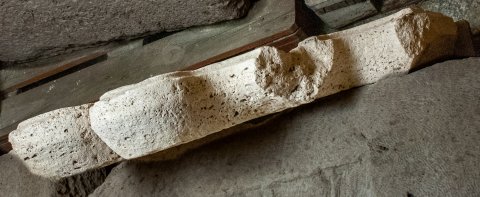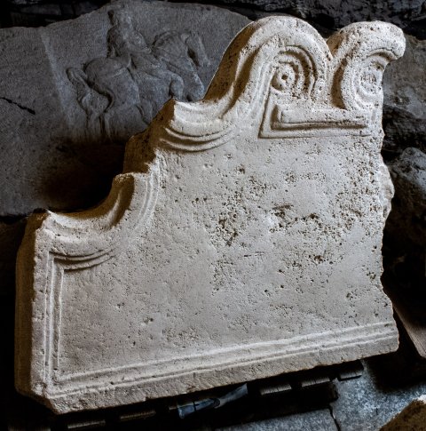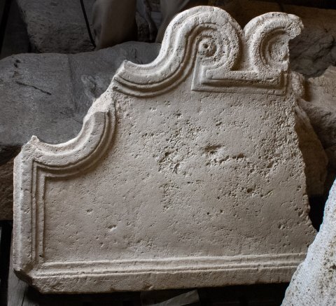 - Platte eines Monopodium. Profilierter Rahmen, der an einer Längsseite vierfach einschwingt und zwei Voluten bildet.