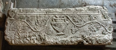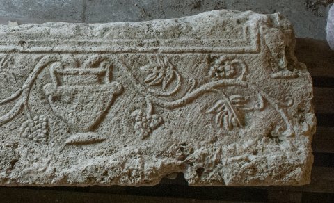 - Unter dem unteren Rahmen des Schriftfeldes Krater mit Weinranken, neben beiden unteren Ecken des Schriftfeldes jeweils ein Gefäß, aus dem Ranken nach oben wachsen.