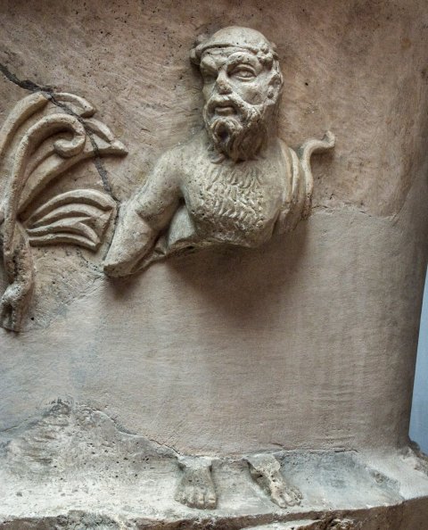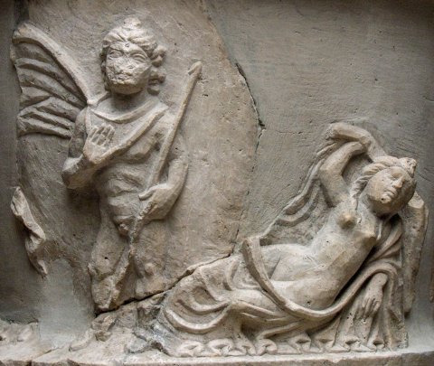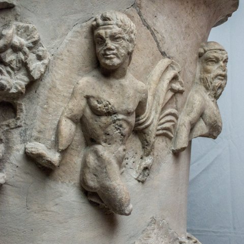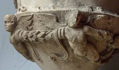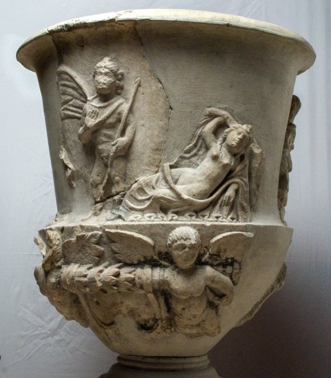- Mythos, Musikinstrument, Genius: Krater mit abgestuftem Gefäßkörper, auf dem steilwandigen oberen Teil Thiasos mit schlafender Ariadne, links von ihr Dionysos, rechts Mänade mit Doppelflöte, jugendlicher Satyr mit Pedum und Silen. Zwischen Mänade und Satyr Baum. Auf dem unteren Teil der Gefäßwand vier schwebende geflügelte Knaben, deren mit Tänien umwickelte Arme in miteinander verbundenen Blattgirlanden enden.