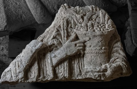 - Oberkörper eines Mädchens mit Ärmeltunica und über beide Schultern gelegtem Mantel, im linken Arm großer Korb mit Früchten. Auf dem rechten Oberarm Hand einer hinter dem Mädchen stehenden Frau.