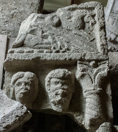 - Eingeschriebener Giebel, im rechten Eck liegender Erot (?), auf der Schräge Meerwesen (Hippokamp). Hauptbild mit Brustbildern (?) einer Familie zwischen Säulen mit Spiralkanneluren. Erhalten sind in der rechten oberen Ecke die Köpfe einer Frau mit gescheiteltem Haar und eines bärtigen Mannes. Links mindestens zwei weitere Personen.