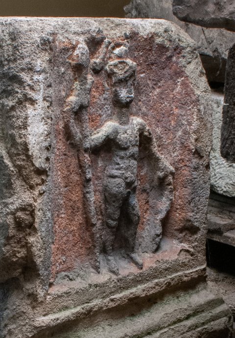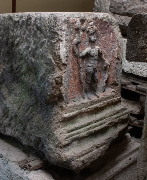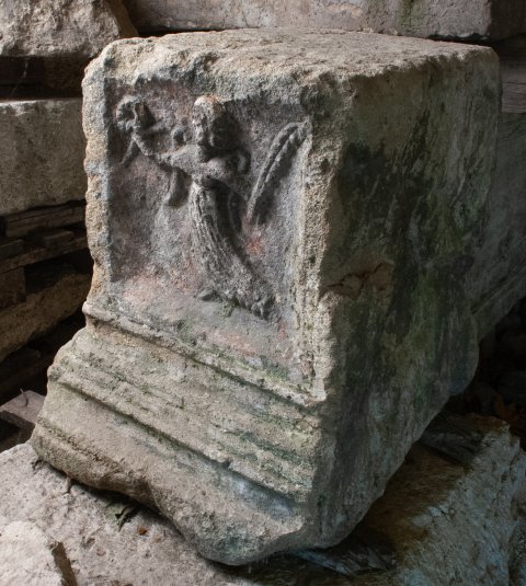 - Mythische Figur: auf den Nebenseiten vertiefte, einfach gerahmte Bildfelder. Rechts geflügelte, langewandete Victoria in Schrittstellung nach links, in der Rechten Kranz, in der Linken Palmzweig. Links nackter Mars mit Helm, die erhobene Rechte auf die Lanze, die Linke auf den Schild gestützt. Auf beiden Nebenseiten profilierte Sockelzone.