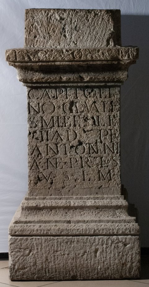 - I(ovi) o(ptimo) m(aximo) // Capitoli/no Cl(audius) Valen/s miles le/g(ionis) II ad(iutricis) p(iae) f(idelis) / Antonini/an(a)e pr(o) (se) et s(uis) / v(otum) s(olvit) l(ibens) m(erito)