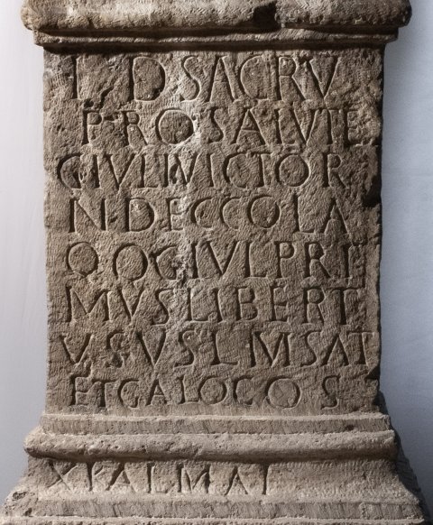 - I(nvicto) d(eo) sacru(m) / pro salute / G(ai) Iuli Victor(i)/n(i) dec(urionis) col(oniae) A(uincensium) / q(uin)q(uennalis) G(aius) Iul(ius) Pri/mus libert/us v(otum) s(olvit) l(ibens) m(erito) Sat(urnino) / et Gal(l)o co(n)s(ulibus) // X Kal(endas) Mai(as)