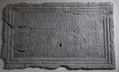 - Deae Isidi templum a solo / L(ucius) Annusius Magianus / de suo posuit vik(anis) Aquensib(us) / ad cuius templi ornamenta / Alpinia Alpinula coniunx / et Peregrina fil(ia) |(denarios) C dede/runt l(ocus) d(atus) d(ecreto) vicanorum
