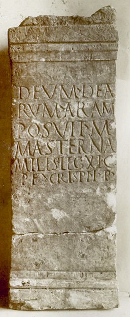 - Deum dea/rum aram / posuit M(arcus) / Masterna / miles leg(ionis) XI C(laudiae) / P(iae) F(elicis) (centuria) Crispi I() P()