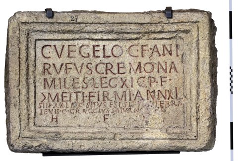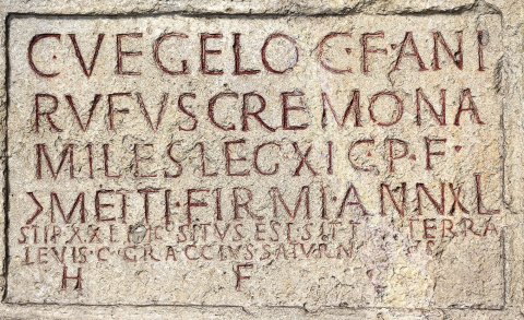 - C(aius) Vegelo C(ai) f(ilius) Ani(ensi) / Rufus Cremona / miles leg(ionis) XI C(laudiae) p(iae) f(idelis) / |(centuria) Metti Firmi ann(orum) XL / stip(endiorum) XXI hic situs est sit tibi terra / levis C(aius) Graccius Saturninus / h(eres) f(aciendum) c(uravit)