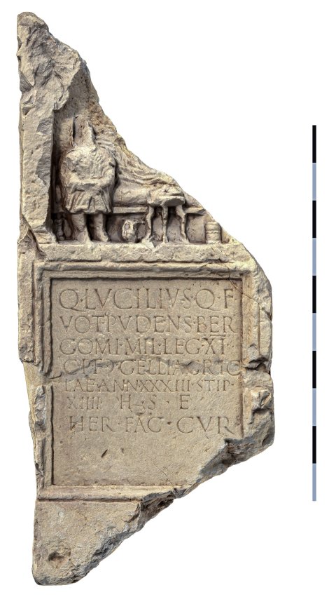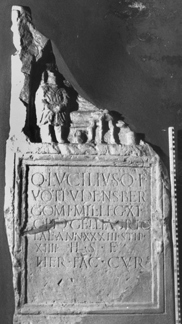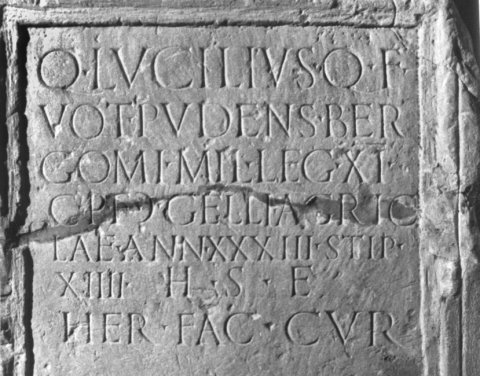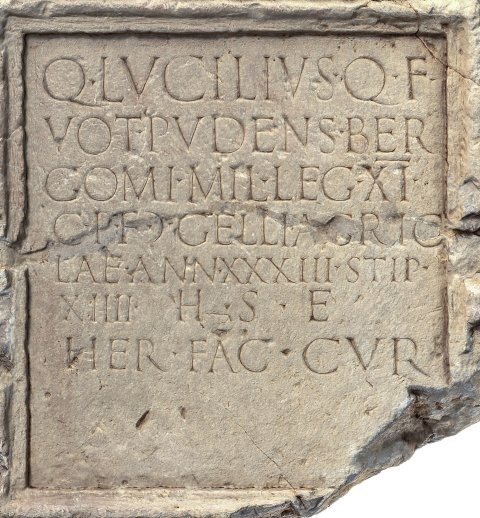 - Q(uintus) Lucilius Q(uinti) f(ilius) / Vot(uria) Pudens Ber/gomi mil(es) leg(ionis) XI C(laudiae) p(iae) f(idelis) |(centuria) Gelli Agrico/lae ann(orum) XXXIII stip(endiorum) / XIIII h(ic) s(itus) e(st) / her(es) fac(iendum) cur(avit)