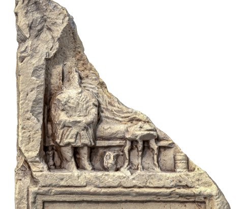 Bogennische mit seitlichen Pilastern. Totenmahl : links stehender Diener vor dem Fußende der Kline. Unter dieser Krug und zylindrischer Behälter (Rollenbehälter ?), dazwischen dreibeiniges Tischchen mit Fruchtschale.