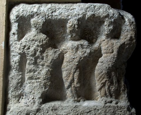 - Mythische Figuren: Auf der Vorderseite in Bogennische stehender Mercur mit Mantel um den linken Arm, Flügelkappe, in der Rechten Geldbeutel, in der Linken Caduceus, neben dem rechten Fuß liegender Ziegenbock. Auf der linken Nebenseite im oberen Drittel eingetieftes Rechteckfeld mit drei stehenden bekleideten Frauenfiguren, die sich gegenseitig umfassen (Weggöttinnen ? Matronen ?).
