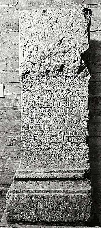 - [I(ovi) o(ptimo) m(aximo) Teutano] / [[ pro sal(ute) adque incolu/mitate Imp(eratoris) Caes(aris) Aur(elii) / Probi Pii Fel(icis) inv(icti) ]] / Aug(usti) totius que / domus divinae / et civitati(s) Eravis/corum Iul(ius) / Domitianus et Cl(audius) Di(v)es II vv(iri) / col(oniae) Aq(uincensium) dedica/verunt (ante diem) III Idus / Iunias [[ Imp(eratore) Probo / Aug(usto) V et ]] / Victorino co(n)s(ulibus)