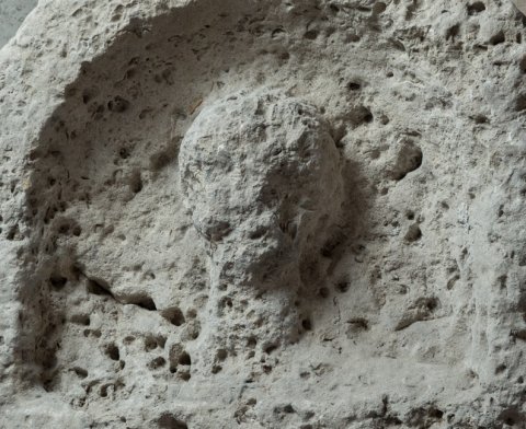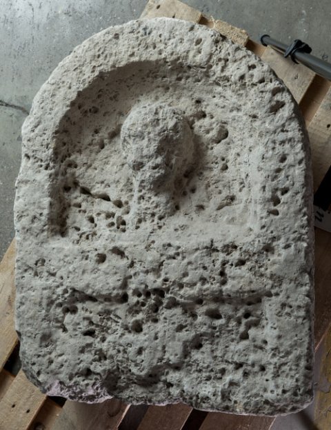 - Im rundbogigen Stelenabschluss Büste eines Mannes.