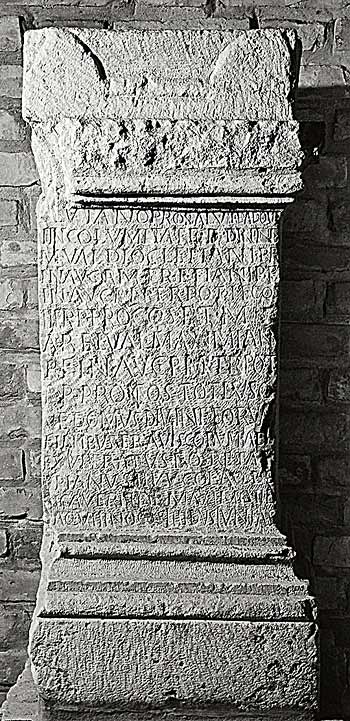b) [ I(ovi) o(ptimo) m(aximo)] / [T]eutano pro salute adqu[e] / incolumitate dd(ominorum) nn(ostrorum) / M(arci) Val(erii) Diocletiani p(ii) f(elicis) / in(victi) Aug(usti) p(o)n(tificis) m(aximi) tr(ibunicia) etiani p(ii) f(elicis) / in(victi) Aug(usti) PN tr(ibunicia) pot(estate) II co(n)[s(ulis)] / III p(atris) p(atriae) proco(n)s(ulis) et M(arci) / A(u)rel(ii) Val(eraiani) Maximian[i] / p(ii) f(elicis) in(victi) Aug(usti) p(ontificis) m(aximi) tr(ibunicia pot(estate) / p(atris) p(atriae) proco(n)s(ulis) totiusq/ue domus divin(a)e eorum / finibus Eraviscorum Ael(ius) / Exuperatus eq(ues) R(omanus) et A[el(ius)] / Ulpianus II vv(iri) col(oniae) Aq(uincensium) de/[d]icaverunt Maximo II e[t]/ Aquilino co(n)s(ulibus) (ante diem) III Idus Iunias - Funktion