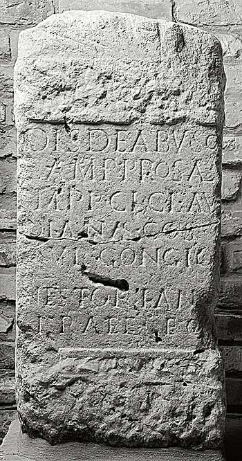 - Di(i)s deabusq(ue) / Camp(estribus) pro sal(ute) / [I]mpp(eratorum) Cl(audius) Clau/dianus co(n)s(ularis) / [c]ur(ante) Gongio / Nestorian[o] / praef(ecto) eq(uitum)