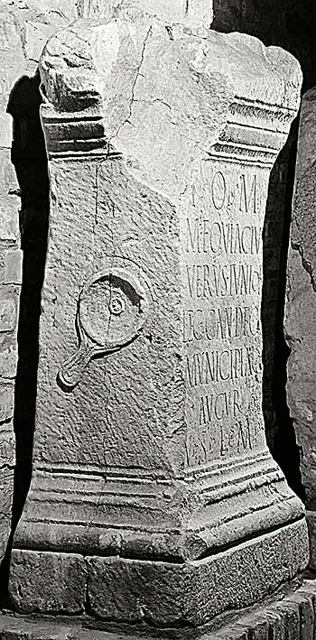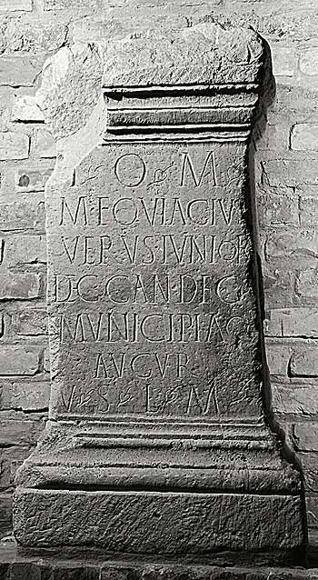 - I(ovi) o(ptimo) m(aximo) / M(arcus) Foviacius / Verus Iunior / dec(urio) can(abarum) dec(urio) / municipi(i) Aq(uincensium) / augur / v(otum) s(olvit) l(ibens) m(erito)