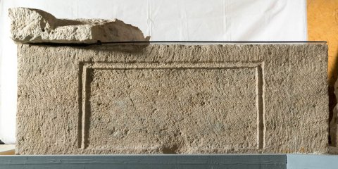 - Sarkophagkasten mit rechteckigem Schriftfeld, Deckel mit Eckakroteren (zugehörig ?).