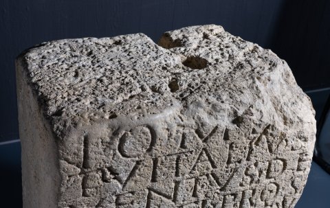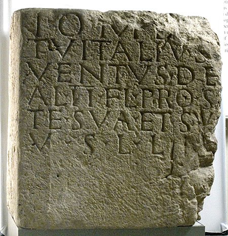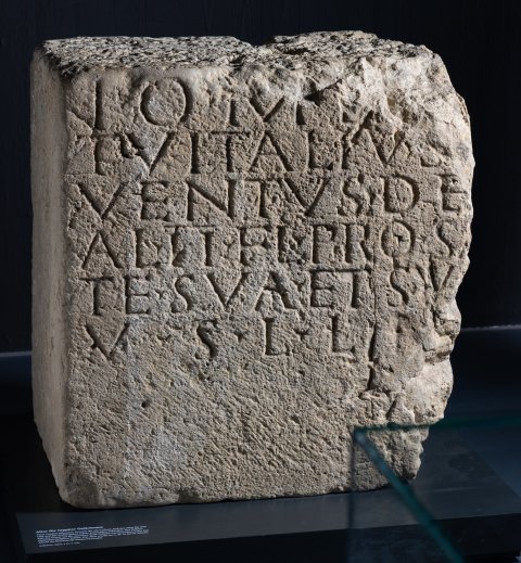 - I(ovi) O(ptimo) M(aximo) D[ol(icheno)] / T(itus) Vitalius [Ad]/ventus de[c(urio)] / al(ae) II Fl(aviae) pro s[alu]/te sua et su[or(um)] / v(otum) s(olvit) l(ibens) l(aetus) m(erito)